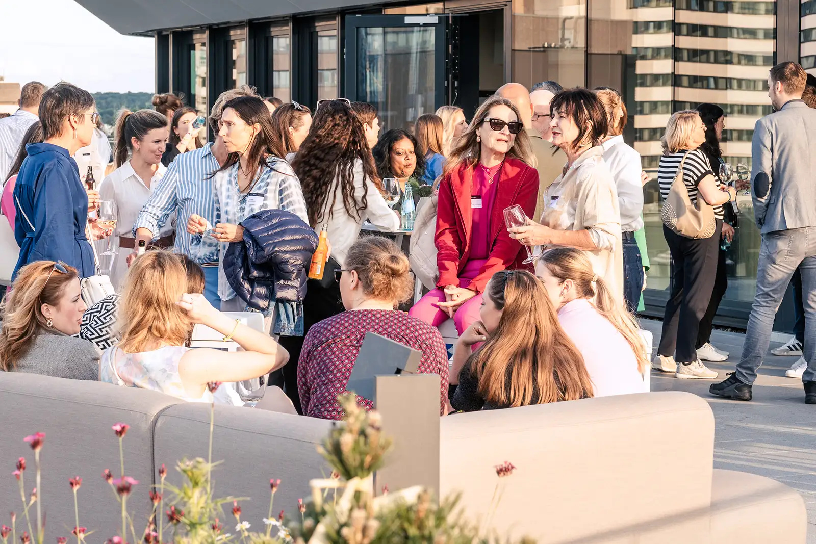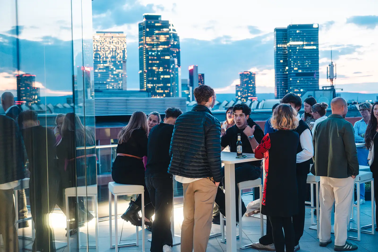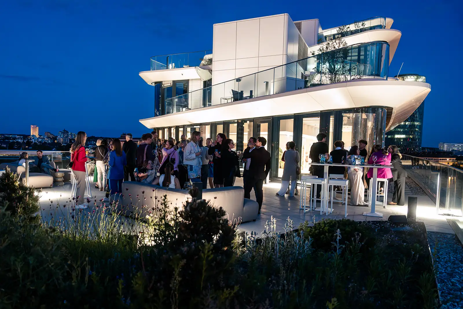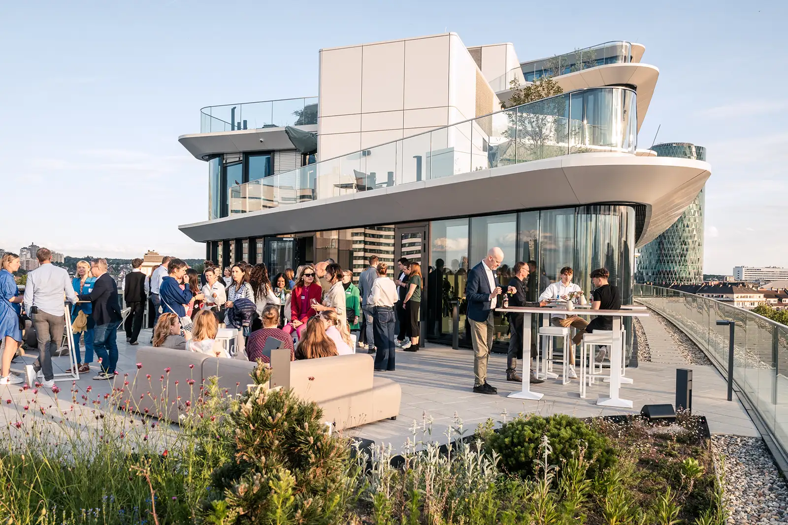 Mit einem atemberaubenden Ausblick auf die Skyline Frankfurts und einer exklusiven 262 qm Dachterrasse ist diese beeindruckende Location mit modernem und dennoch gemütlichem Ambiente die perfekte Kulisse, um einen wundervollen Abend im Sinne der nachhaltigen und impact-orientierten Events der Zukunft zu feiern.